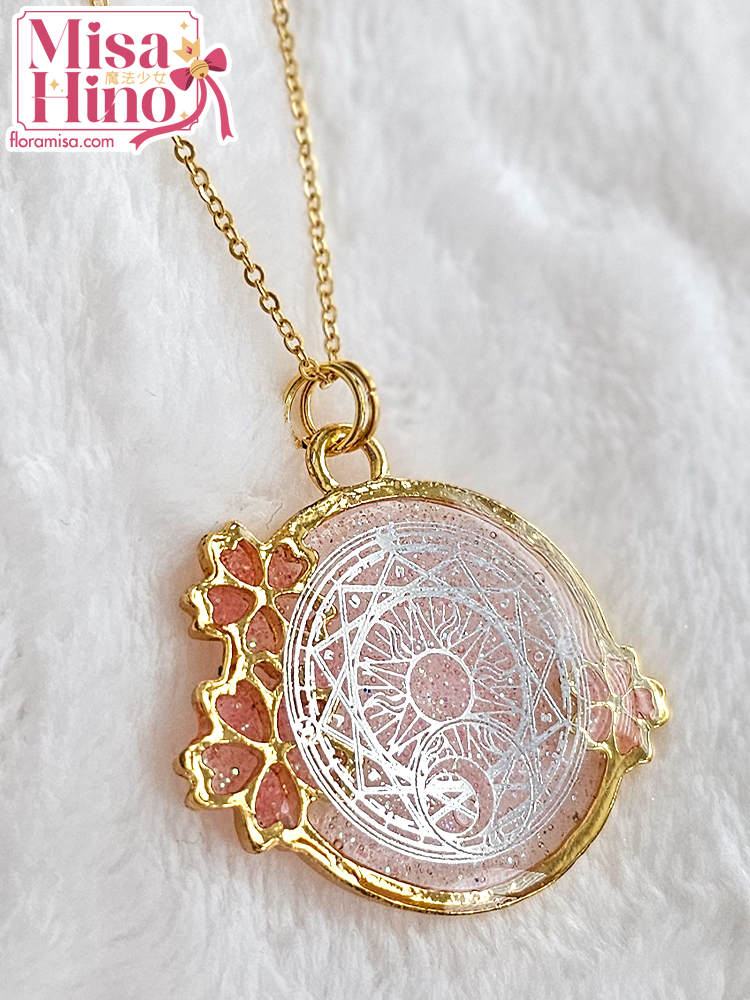 A pink magic circle with flower motifs. This charm comes as a necklace by default. Please see add-ons category for additional options.