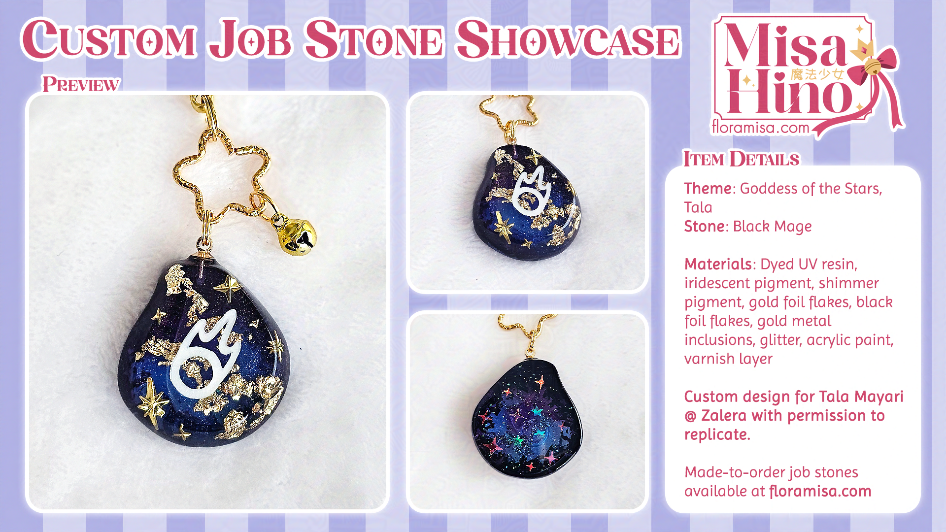 A custom job stone commissioned by Tala Mayari @ Zalera as a tribute to the goddess of the stars in Tagalog mythology, Tala. This design features a transparent shimmery/iridescent purple mix to iridescent blue gradient with black foil flakes behind the design for an extra "galaxy" effect. There are gold foil flakes and metal inclusions to depict a starry night sky surrounded by gold dust.