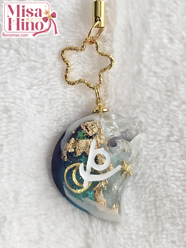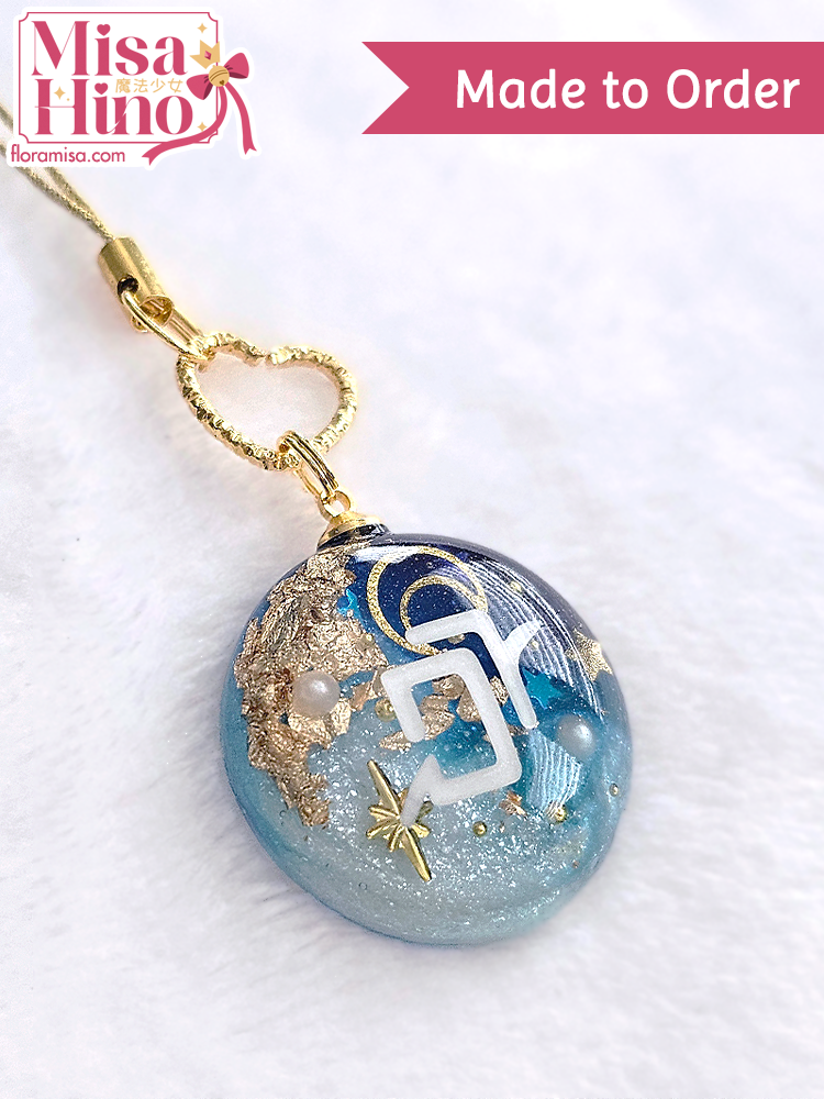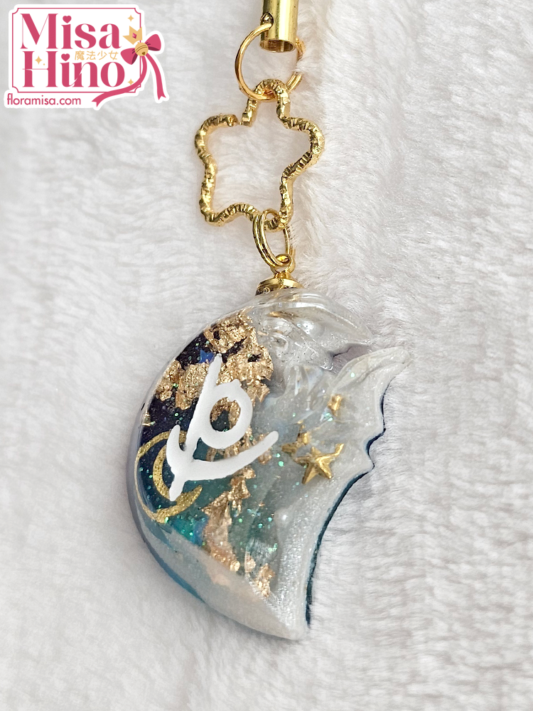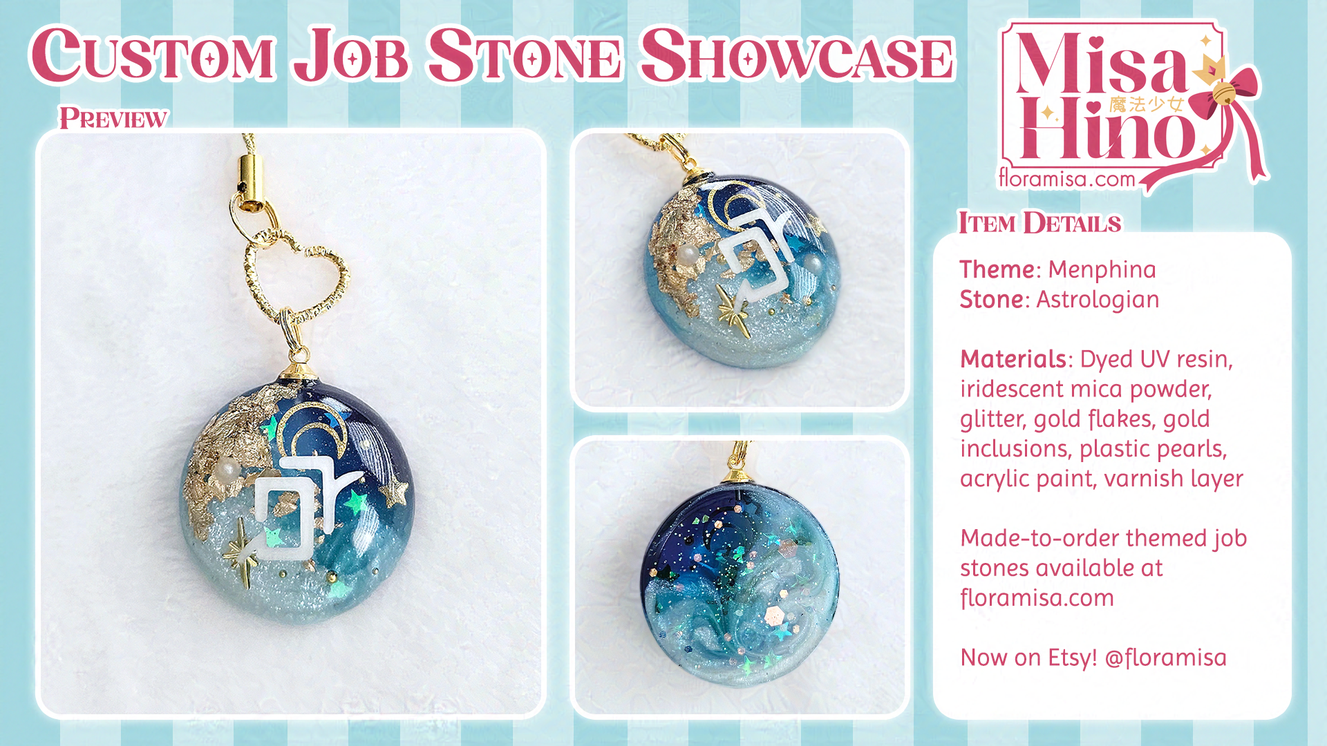 A Menphina inspired custom FFXIV job stone featuring the teal/blue/white from her character design + purple/black as a call to Dalamud. The gold moon/star and pearl inclusions represent the moon and night sky of her theme.