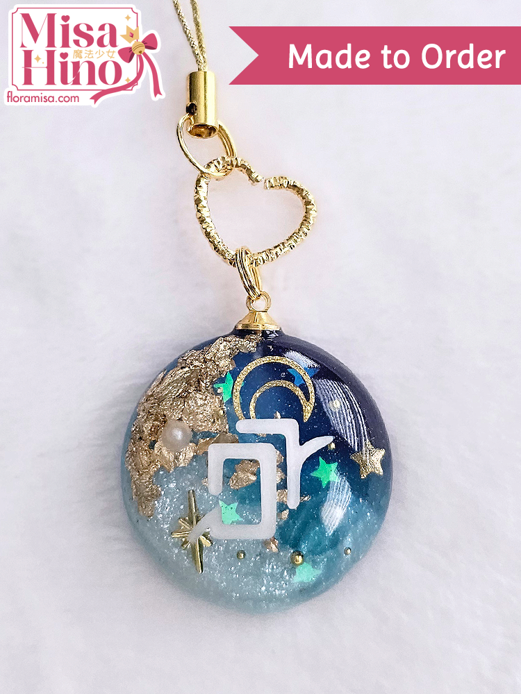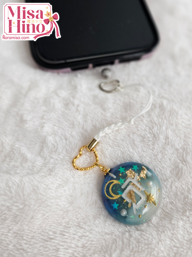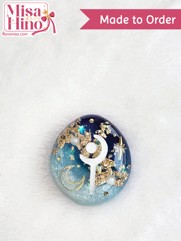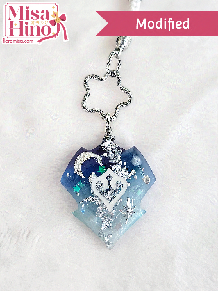 A Menphina inspired custom FFXIV job stone featuring the teal/blue/white from her character design + purple/black as a call to Dalamud. The gold moon/star and pearl inclusions represent the moon and night sky of her theme.