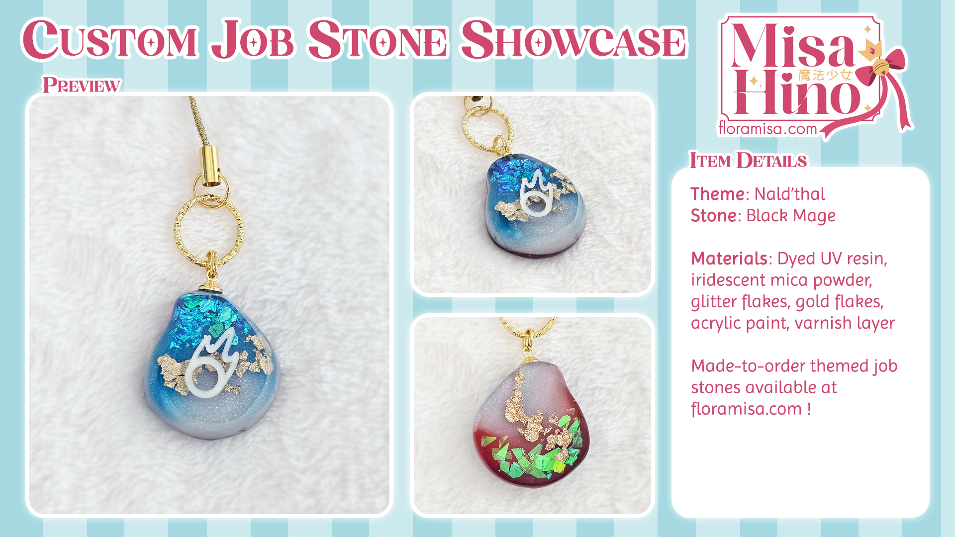A Nald'thal inspired custom FFXIV job stone featuring a double-sided design with "blue flames" on the front and "red flames" on the back - inspired by his character design - with gold inclusions.