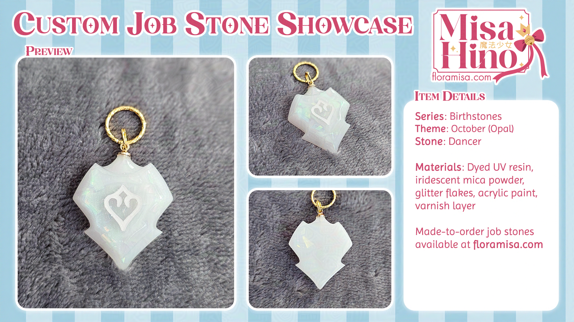 This job stone is part of my birthstone series, representing opal for October. I used glitter flakes to imitate the flash, and the color mix has white + iridescent green and blue pigments to imitate the cloudiness of the precious stone.