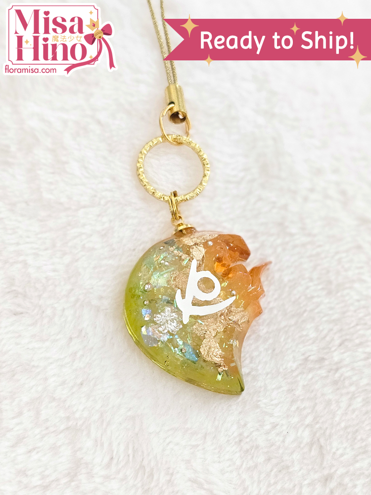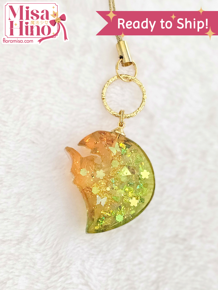 A Nophica inspired custom FFXIV job stone featuring the yellow-green and orange from her character design + gold and flower inclusions. This is a restocked item, so what you see is what you get.