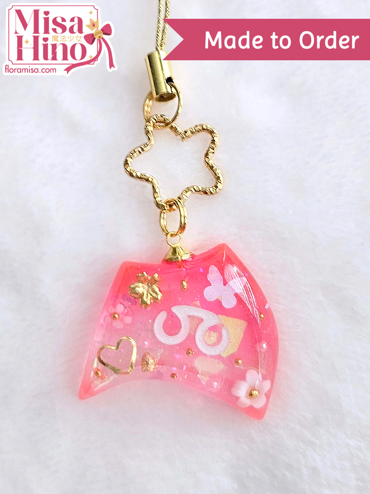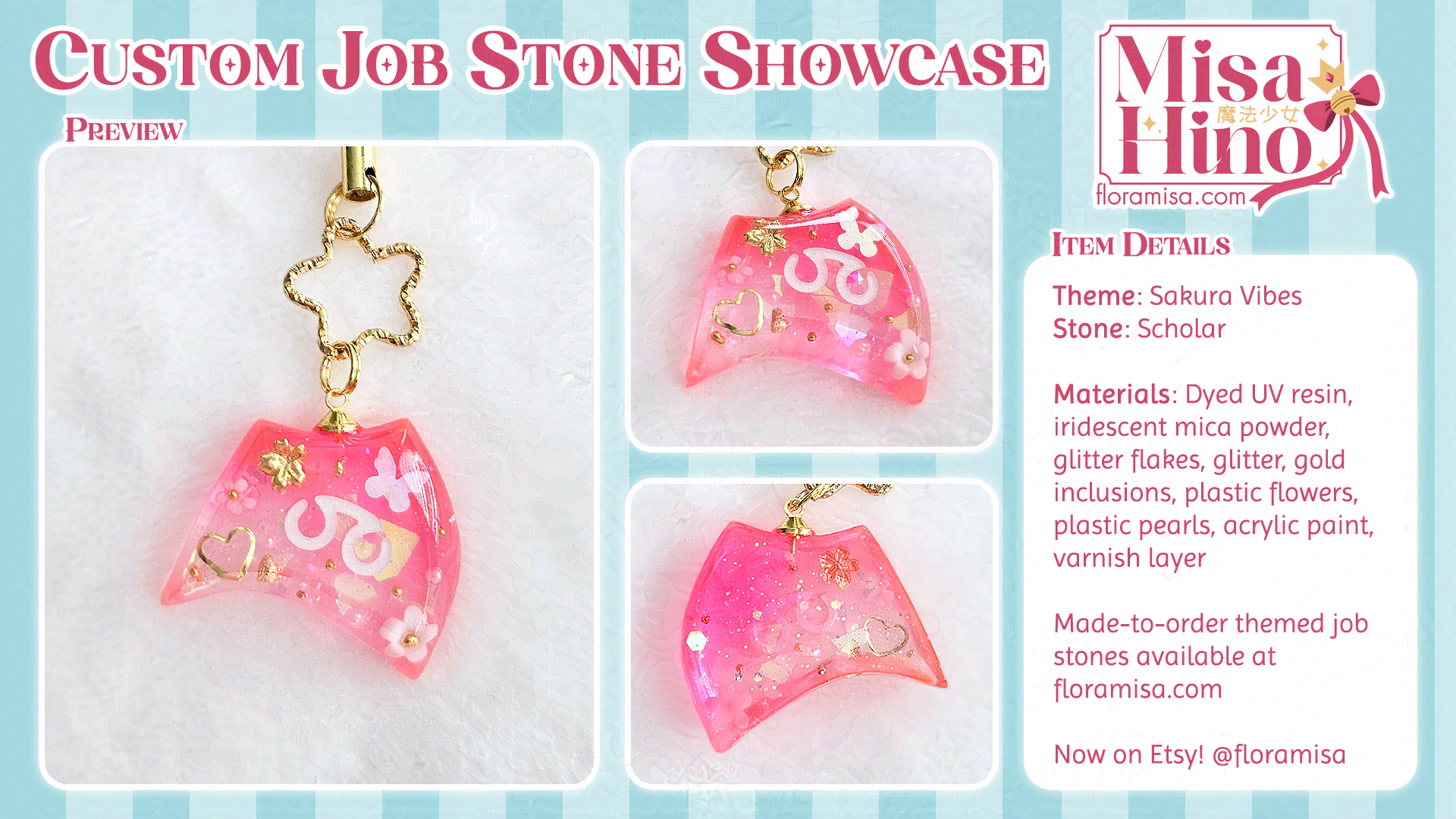 A cherry blossom themed custom FFXIV job stone featuring a bright pink design + floral and gold inclusions.