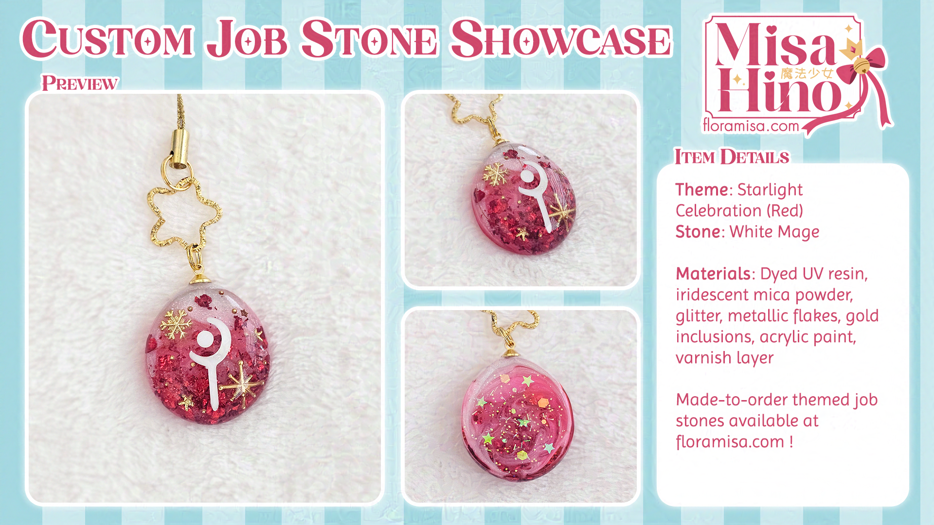 A custom job stone inspired by the Final Fantasy XIV in-game holiday, Starlight Celebration. This listing is for the gold metal version, but a silver one is available as well. I can use any color for the glitter if you prefer one that isn't shown in the preview image (please leave a note in your order).